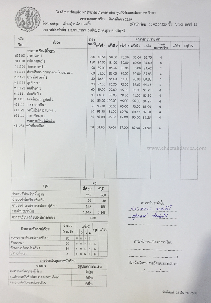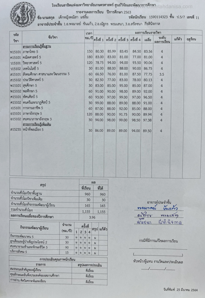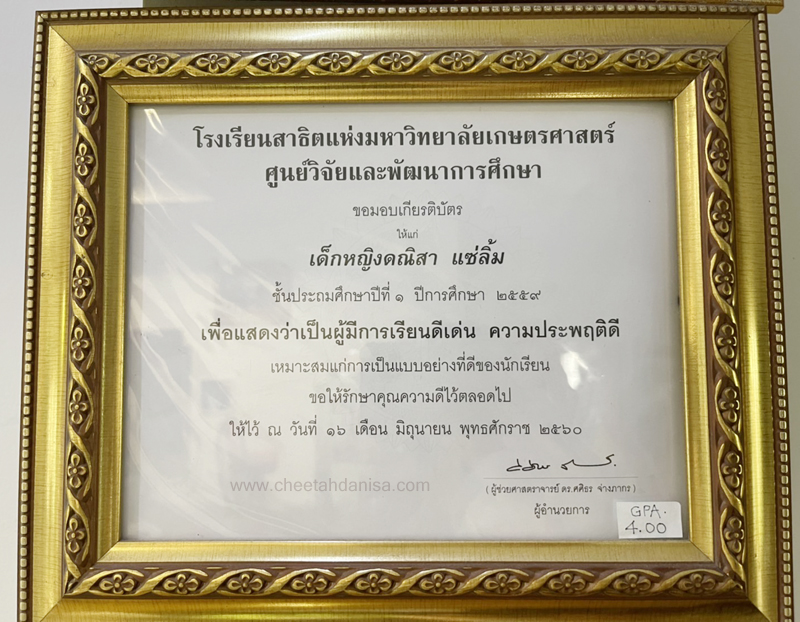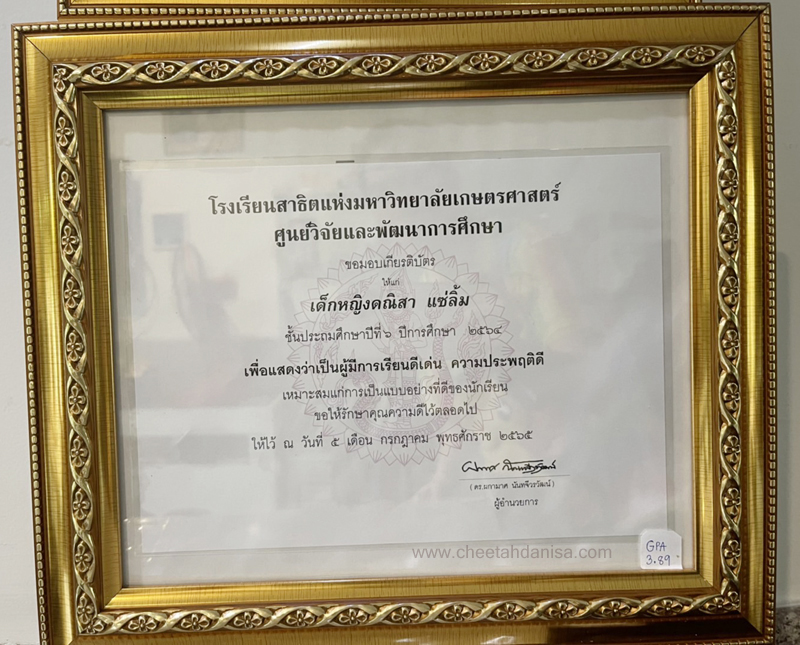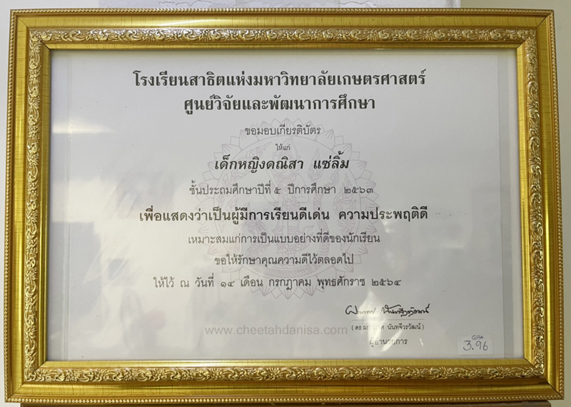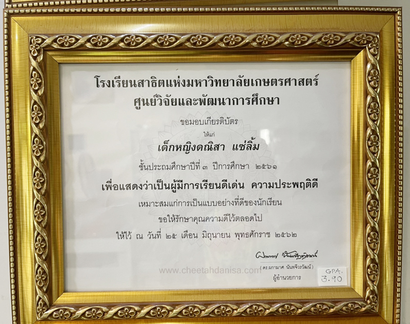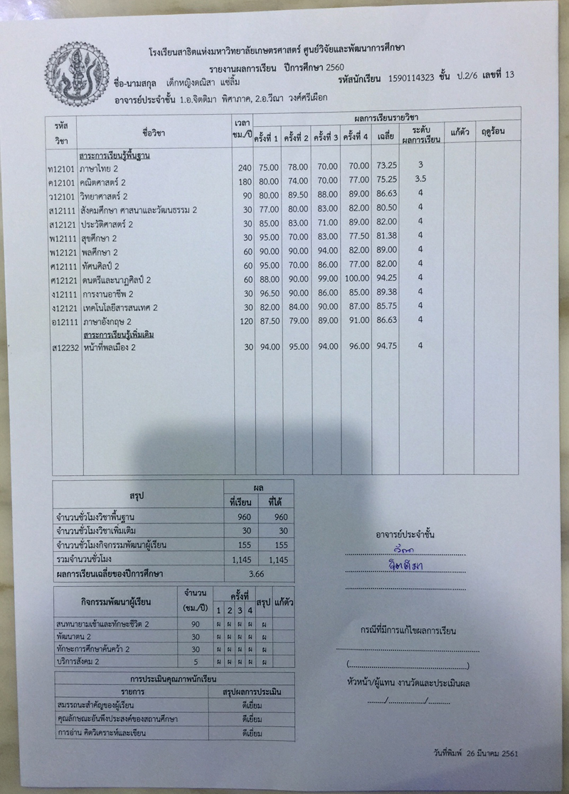 -รางวัลเกียรติบัตรผู้มีการเรียนดีเด่น ความประพฤติดี มัธยมปีที่ 1, ปีการศึกษา 2565 - รายงานการประเมินคุณลักษณะอันพึงประสงค์ และสมรรถนะสำคัญของผู้เรียน, ระดับ = ดีเยี่ยม - รายงานผลการเรียนระดับชั้นมัธยมศึกษาปีที่ 1 (ม.1/5), ปีการศึกษา 2565 (ภาคต้น 3.79, ภาคปลาย 3.39), เกรดเฉลี่ย (GPA) = 3.59 - รายงานการประเมินคุณลักษณะอันพึงประสงค์ และสมรรถนะสำคัญของผู้เรียน, ระดับ = ดีเยี่ยม --------------------------------------------------------------------------------------------------------------------------------------------------- - รายงานผลการเรียนระดับชั้นประถมศึกษาปีที่ 6 (ป.6/7), ปีการศึกษา 2564, เกรดเฉลี่ย (GPA) = 3.89 -รางวัลเกียรติบัตรผู้มีการเรียนดีเด่น ความประพฤติดี ชั้นประถมศึกษา 6, ปีการศึกษา 2564 - รายงานการประเมินคุณลักษณะอันพึงประสงค์ และสมรรถนะสำคัญของผู้เรียน, ระดับ = ดีเยี่ยม - รายงานผลการเรียนระดับชั้นประถมศึกษาปีที่ 5 (ป.5/7), ปีการศึกษา 2563, เกรดเฉลี่ย (GPA) = 3.96 -รางวัลเกียรติบัตรผู้มีการเรียนดีเด่น ความประพฤติดี ชั้นประถมศึกษา 5, ปีการศึกษา 2563 - รายงานการประเมินคุณลักษณะอันพึงประสงค์ และสมรรถนะสำคัญของผู้เรียน, ระดับ = ดีเยี่ยม - รายงานผลการเรียนระดับชั้นประถมศึกษาปีที่ 4 (ป.4/1), ปีการศึกษา 2562, เกรดเฉลี่ย (GPA) = 3.74 - รายงานการประเมินคุณลักษณะอันพึงประสงค์ และสมรรถนะสำคัญของผู้เรียน, ระดับ = ดีเยี่ยม - รางวัลเกียรติบัตรผู้มีการเรียนดีเด่น ความประพฤติดี ชั้นประถมศึกษา 3, ปีการศึกษา 2561 - รายงานผลการเรียนระดับชั้นประถมศึกษาปีที่ 3 (ป.3/2), ปีการศึกษา 2561, เกรดเฉลี่ย (GPA) = 3.90 - รายงานผลการทดสอบความสามารถพื้นฐานของผุ้เรียน-ระดับชาติ ชั้นประถมศึกษาปีที่ 3 ปี 2561 (NT), รวมความสามารถทั้ง 3 ด้าน เต็ม 105 ได้ 84 - รายงานการประเมินคุณลักษณะอันพึงประสงค์ และสมรรถนะสำคัญของผู้เรียน, ระดับ = ดีเยี่ยม - รายงานผลการเรียนระดับชั้นประถมศึกษาปีที่ 2 (ป.2/6), ปีการศึกษา 2560, เกรดเฉลี่ย (GPA) = 3.66 - รายงานการประเมินคุณลักษณะอันพึงประสงค์ และสมรรถนะสำคัญของผู้เรียน, ระดับ = ดีเยี่ยม - รายงานผลการเรียนระดับชั้นประถมศึกษาปีที่ 1 (ป.1/2), ปีการศึกษา 2559, เกรดเฉลี่ย (GPA) = 4.00 รางวัลเกียรติบัตรผู้มีการเรียนดีเด่น ความประพฤติดี ชั้นประถมศึกษา 1, ปีการศึกษา 2559 - รายงานการประเมินคุณลักษณะอันพึงประสงค์ และสมรรถนะสำคัญของผู้เรียน, ระดับ = ดีเยี่ยม - ผลคะแนนใบงานวิชาหน้าที่สังคมพลเมือง ระดับประถมศึกษาปีที่ 3, 2561, คะแนนเต็ม 35 คะแนน, ระดับคะแนนที่ได้ 35 คะแนน - ผลคะแนนใบงานวิชาหน้าที่สังคมพลเมือง ระดับประถมศึกษาปีที่ 2, 2560, คะแนนเต็ม 35 คะแนน, ระดับคะแนนที่ได้ 35 คะแนน - ผลคะแนนใบงานวิชาหน้าที่สังคมพลเมือง ระดับประถมศึกษาปีที่ 1 ปี 2559, คะแนนเต็ม 35 คะแนน, ระดับคะแนนที่ได้ 35 