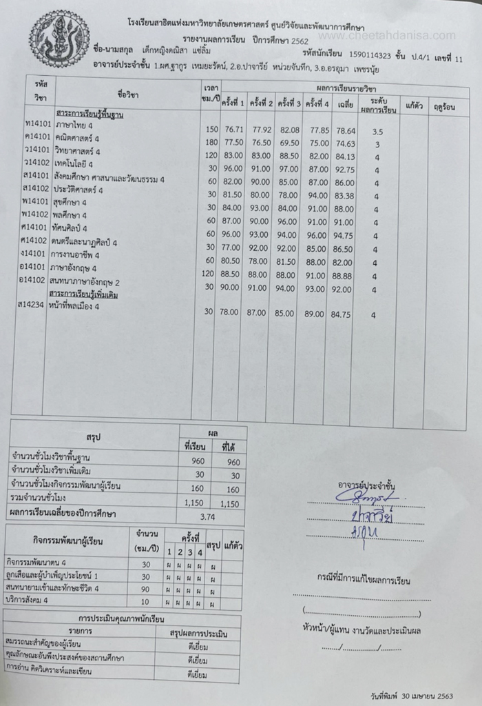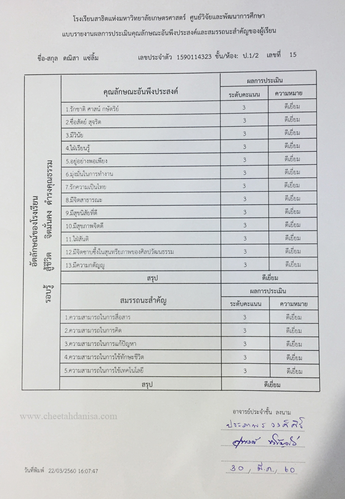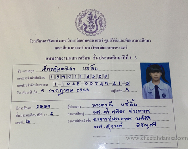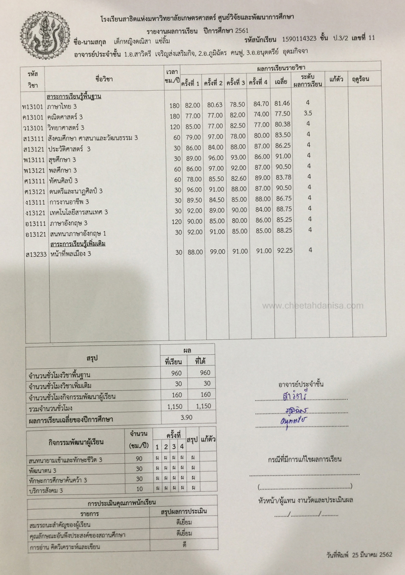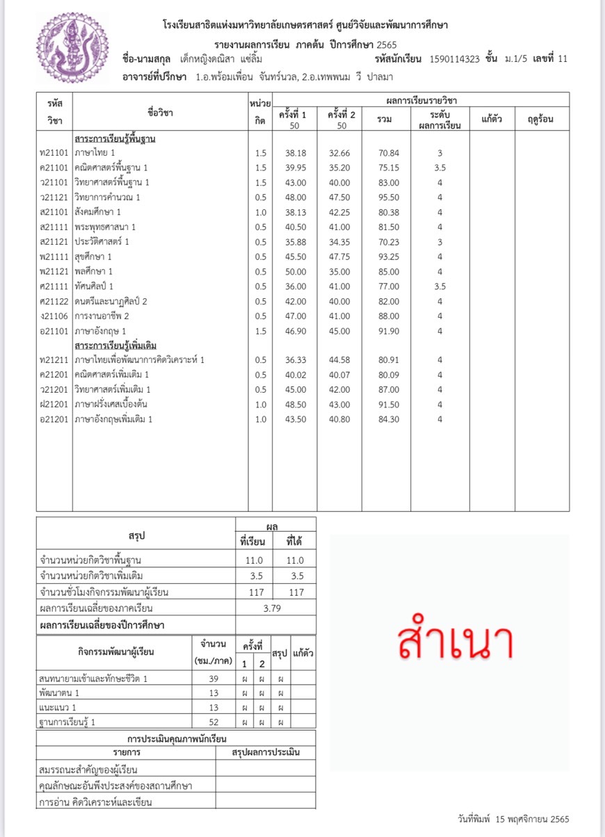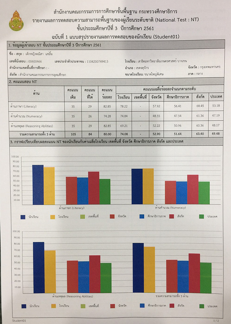 -รางวัลเกียรติบัตรผู้มีการเรียนดีเด่น ความประพฤติดี มัธยมปีที่ 1, ปีการศึกษา 2565 - รายงานการประเมินคุณลักษณะอันพึงประสงค์ และสมรรถนะสำคัญของผู้เรียน, ระดับ = ดีเยี่ยม - รายงานผลการเรียนระดับชั้นมัธยมศึกษาปีที่ 1 (ม.1/5), ปีการศึกษา 2565 (ภาคต้น 3.79, ภาคปลาย 3.39), เกรดเฉลี่ย (GPA) = 3.59 - รายงานการประเมินคุณลักษณะอันพึงประสงค์ และสมรรถนะสำคัญของผู้เรียน, ระดับ = ดีเยี่ยม --------------------------------------------------------------------------------------------------------------------------------------------------- - รายงานผลการเรียนระดับชั้นประถมศึกษาปีที่ 6 (ป.6/7), ปีการศึกษา 2564, เกรดเฉลี่ย (GPA) = 3.89 -รางวัลเกียรติบัตรผู้มีการเรียนดีเด่น ความประพฤติดี ชั้นประถมศึกษา 6, ปีการศึกษา 2564 - รายงานการประเมินคุณลักษณะอันพึงประสงค์ และสมรรถนะสำคัญของผู้เรียน, ระดับ = ดีเยี่ยม - รายงานผลการเรียนระดับชั้นประถมศึกษาปีที่ 5 (ป.5/7), ปีการศึกษา 2563, เกรดเฉลี่ย (GPA) = 3.96 -รางวัลเกียรติบัตรผู้มีการเรียนดีเด่น ความประพฤติดี ชั้นประถมศึกษา 5, ปีการศึกษา 2563 - รายงานการประเมินคุณลักษณะอันพึงประสงค์ และสมรรถนะสำคัญของผู้เรียน, ระดับ = ดีเยี่ยม - รายงานผลการเรียนระดับชั้นประถมศึกษาปีที่ 4 (ป.4/1), ปีการศึกษา 2562, เกรดเฉลี่ย (GPA) = 3.74 - รายงานการประเมินคุณลักษณะอันพึงประสงค์ และสมรรถนะสำคัญของผู้เรียน, ระดับ = ดีเยี่ยม - รางวัลเกียรติบัตรผู้มีการเรียนดีเด่น ความประพฤติดี ชั้นประถมศึกษา 3, ปีการศึกษา 2561 - รายงานผลการเรียนระดับชั้นประถมศึกษาปีที่ 3 (ป.3/2), ปีการศึกษา 2561, เกรดเฉลี่ย (GPA) = 3.90 - รายงานผลการทดสอบความสามารถพื้นฐานของผุ้เรียน-ระดับชาติ ชั้นประถมศึกษาปีที่ 3 ปี 2561 (NT), รวมความสามารถทั้ง 3 ด้าน เต็ม 105 ได้ 84 - รายงานการประเมินคุณลักษณะอันพึงประสงค์ และสมรรถนะสำคัญของผู้เรียน, ระดับ = ดีเยี่ยม - รายงานผลการเรียนระดับชั้นประถมศึกษาปีที่ 2 (ป.2/6), ปีการศึกษา 2560, เกรดเฉลี่ย (GPA) = 3.66 - รายงานการประเมินคุณลักษณะอันพึงประสงค์ และสมรรถนะสำคัญของผู้เรียน, ระดับ = ดีเยี่ยม - รายงานผลการเรียนระดับชั้นประถมศึกษาปีที่ 1 (ป.1/2), ปีการศึกษา 2559, เกรดเฉลี่ย (GPA) = 4.00 รางวัลเกียรติบัตรผู้มีการเรียนดีเด่น ความประพฤติดี ชั้นประถมศึกษา 1, ปีการศึกษา 2559 - รายงานการประเมินคุณลักษณะอันพึงประสงค์ และสมรรถนะสำคัญของผู้เรียน, ระดับ = ดีเยี่ยม - ผลคะแนนใบงานวิชาหน้าที่สังคมพลเมือง ระดับประถมศึกษาปีที่ 3, 2561, คะแนนเต็ม 35 คะแนน, ระดับคะแนนที่ได้ 35 คะแนน - ผลคะแนนใบงานวิชาหน้าที่สังคมพลเมือง ระดับประถมศึกษาปีที่ 2, 2560, คะแนนเต็ม 35 คะแนน, ระดับคะแนนที่ได้ 35 คะแนน - ผลคะแนนใบงานวิชาหน้าที่สังคมพลเมือง ระดับประถมศึกษาปีที่ 1 ปี 2559, คะแนนเต็ม 35 คะแนน, ระดับคะแนนที่ได้ 35 