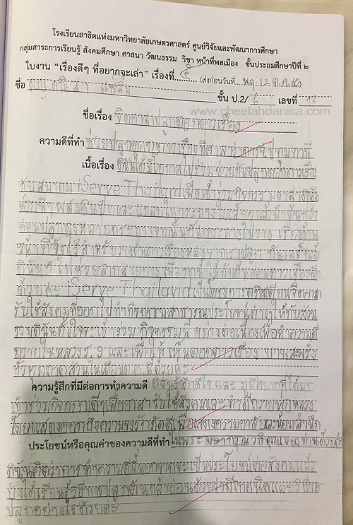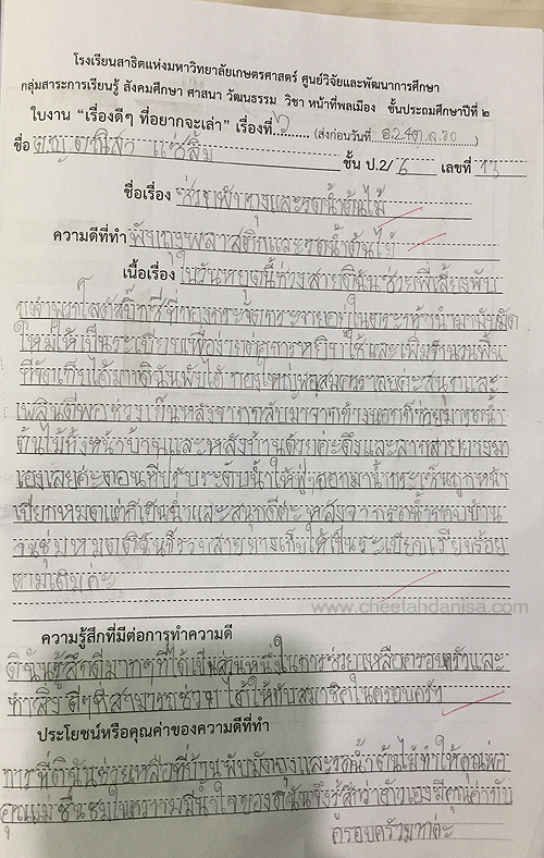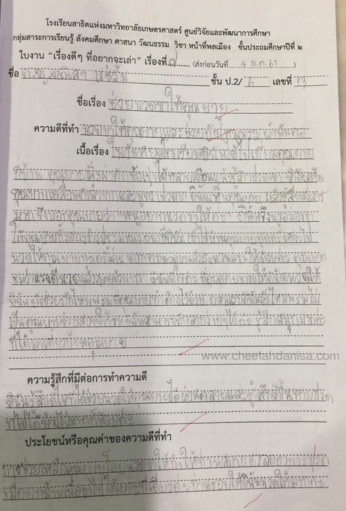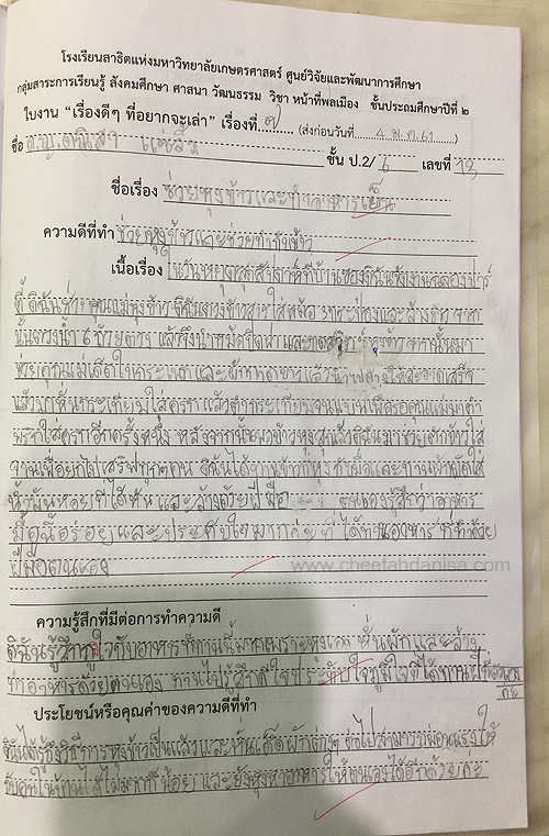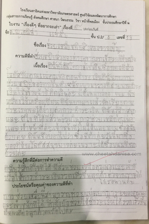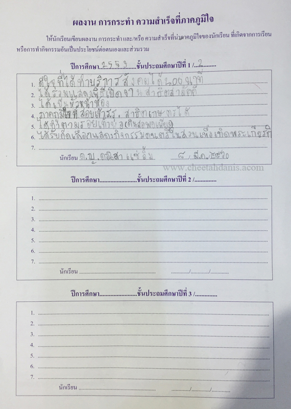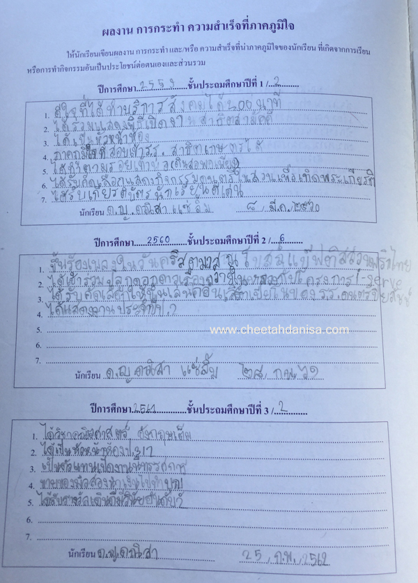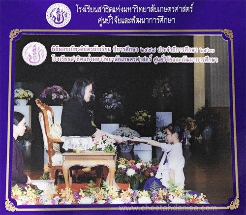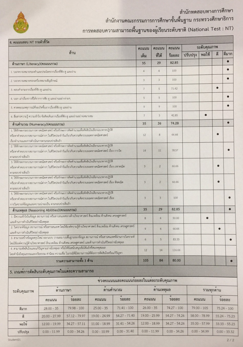 -รางวัลเกียรติบัตรผู้มีการเรียนดีเด่น ความประพฤติดี มัธยมปีที่ 1, ปีการศึกษา 2565 - รายงานการประเมินคุณลักษณะอันพึงประสงค์ และสมรรถนะสำคัญของผู้เรียน, ระดับ = ดีเยี่ยม - รายงานผลการเรียนระดับชั้นมัธยมศึกษาปีที่ 1 (ม.1/5), ปีการศึกษา 2565 (ภาคต้น 3.79, ภาคปลาย 3.39), เกรดเฉลี่ย (GPA) = 3.59 - รายงานการประเมินคุณลักษณะอันพึงประสงค์ และสมรรถนะสำคัญของผู้เรียน, ระดับ = ดีเยี่ยม --------------------------------------------------------------------------------------------------------------------------------------------------- - รายงานผลการเรียนระดับชั้นประถมศึกษาปีที่ 6 (ป.6/7), ปีการศึกษา 2564, เกรดเฉลี่ย (GPA) = 3.89 -รางวัลเกียรติบัตรผู้มีการเรียนดีเด่น ความประพฤติดี ชั้นประถมศึกษา 6, ปีการศึกษา 2564 - รายงานการประเมินคุณลักษณะอันพึงประสงค์ และสมรรถนะสำคัญของผู้เรียน, ระดับ = ดีเยี่ยม - รายงานผลการเรียนระดับชั้นประถมศึกษาปีที่ 5 (ป.5/7), ปีการศึกษา 2563, เกรดเฉลี่ย (GPA) = 3.96 -รางวัลเกียรติบัตรผู้มีการเรียนดีเด่น ความประพฤติดี ชั้นประถมศึกษา 5, ปีการศึกษา 2563 - รายงานการประเมินคุณลักษณะอันพึงประสงค์ และสมรรถนะสำคัญของผู้เรียน, ระดับ = ดีเยี่ยม - รายงานผลการเรียนระดับชั้นประถมศึกษาปีที่ 4 (ป.4/1), ปีการศึกษา 2562, เกรดเฉลี่ย (GPA) = 3.74 - รายงานการประเมินคุณลักษณะอันพึงประสงค์ และสมรรถนะสำคัญของผู้เรียน, ระดับ = ดีเยี่ยม - รางวัลเกียรติบัตรผู้มีการเรียนดีเด่น ความประพฤติดี ชั้นประถมศึกษา 3, ปีการศึกษา 2561 - รายงานผลการเรียนระดับชั้นประถมศึกษาปีที่ 3 (ป.3/2), ปีการศึกษา 2561, เกรดเฉลี่ย (GPA) = 3.90 - รายงานผลการทดสอบความสามารถพื้นฐานของผุ้เรียน-ระดับชาติ ชั้นประถมศึกษาปีที่ 3 ปี 2561 (NT), รวมความสามารถทั้ง 3 ด้าน เต็ม 105 ได้ 84 - รายงานการประเมินคุณลักษณะอันพึงประสงค์ และสมรรถนะสำคัญของผู้เรียน, ระดับ = ดีเยี่ยม - รายงานผลการเรียนระดับชั้นประถมศึกษาปีที่ 2 (ป.2/6), ปีการศึกษา 2560, เกรดเฉลี่ย (GPA) = 3.66 - รายงานการประเมินคุณลักษณะอันพึงประสงค์ และสมรรถนะสำคัญของผู้เรียน, ระดับ = ดีเยี่ยม - รายงานผลการเรียนระดับชั้นประถมศึกษาปีที่ 1 (ป.1/2), ปีการศึกษา 2559, เกรดเฉลี่ย (GPA) = 4.00 รางวัลเกียรติบัตรผู้มีการเรียนดีเด่น ความประพฤติดี ชั้นประถมศึกษา 1, ปีการศึกษา 2559 - รายงานการประเมินคุณลักษณะอันพึงประสงค์ และสมรรถนะสำคัญของผู้เรียน, ระดับ = ดีเยี่ยม - ผลคะแนนใบงานวิชาหน้าที่สังคมพลเมือง ระดับประถมศึกษาปีที่ 3, 2561, คะแนนเต็ม 35 คะแนน, ระดับคะแนนที่ได้ 35 คะแนน - ผลคะแนนใบงานวิชาหน้าที่สังคมพลเมือง ระดับประถมศึกษาปีที่ 2, 2560, คะแนนเต็ม 35 คะแนน, ระดับคะแนนที่ได้ 35 คะแนน - ผลคะแนนใบงานวิชาหน้าที่สังคมพลเมือง ระดับประถมศึกษาปีที่ 1 ปี 2559, คะแนนเต็ม 35 คะแนน, ระดับคะแนนที่ได้ 35 